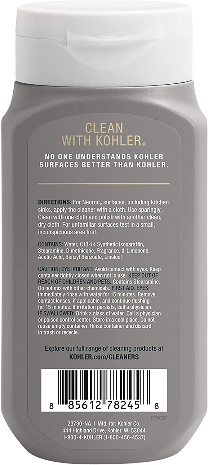 KOHLER premium formula Neoroc cleaner cleans, polishes and protects Neoroc and other composite surfaces. Features KOHLER | minus Kitchen cleaner. Cleans, polishes and protects Neoroc and other composite surfaces. Premium formula provides a protective coating from fingerprints, grease and water spots. Apply with one cloth, polish with another. Non-abrasive cream-based cleaner. 8 fl oz squeeze bottle. May be used on other branded composite surfaces, however testing in an inconspicuous area first is recommended.