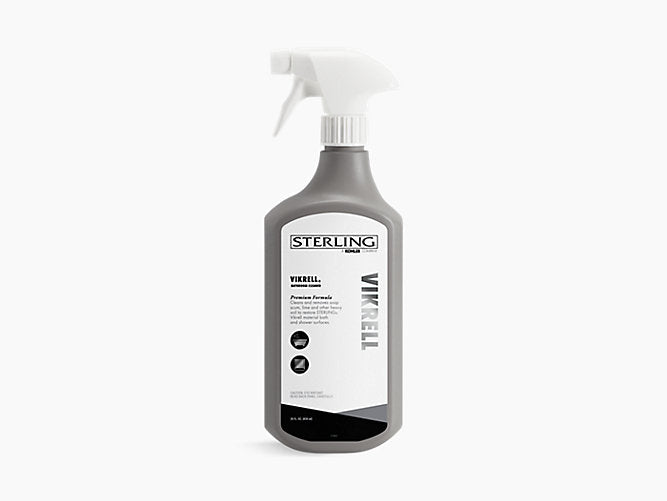 KOHLER premium formula Vikrell cleaner cleans and removes soap scum, lime and other heavy soil from your STERLING® Vikrell material sink, bath and shower surfaces. This cleaner keeps your STERLING Vikrell material products looking like new throughout their lifetime. Features KOHLER | minus Bathroom cleaner. Safely cleans and removes soap scum, grease, lime and other heavy soil from shower and tub surfaces, including tile. Premium formula restores STERLING Vikrell surfaces to their original luster. Ready-to-use spray-and-wipe. Residue-free. 28 fl oz spray bottle. May be used on other branded tub and shower surfaces, however testing in an inconspicuous area first is recommended.